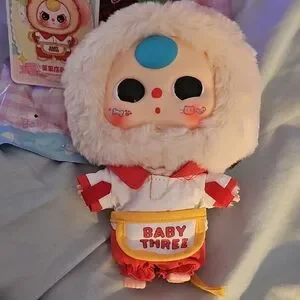 Adorable plush doll with a colorful outfit. Features red, white, and cream colors. Perfect for collectors.