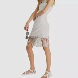 This French Connection white tank dress is perfect for summer with its boho-chic vibe. Featuring a flattering crochet trim with 10" fringe, this piece adds a trendy twist to a classic bodycon silhouette. Whether styled for casual days or dressed up for a warm weather event, this dress makes a statement.