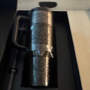 Keep beverages hot or cold with this Stanley travel mug. Features a stylish black and gray design. Includes a sturdy handle and straw.