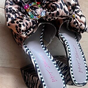 Step out in style with these Betsey Johnson leopard print platform heels. Featuring a bold leopard pattern and colorful accents, these shoes are perfect for making a statement.