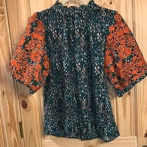 Stylish embroidered puff sleeve blouse with bold floral design. Features vibrant orange and green colors. Perfect for adding flair to your wardrobe. Buttons in back. Nonsmoking home. Looks brand new.