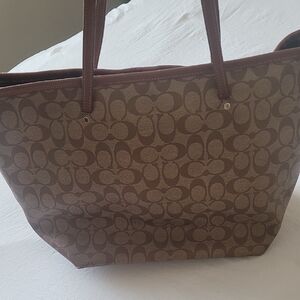 Stylish Coach tote with signature pattern. Perfect for daily use. Elegant tan and brown design.