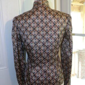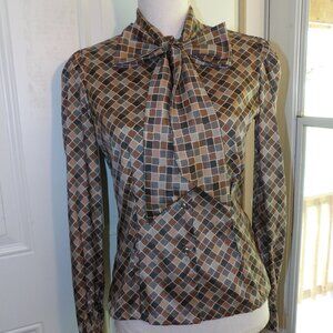 Blouse is a size 5/6 is a vintage top perfect for junior women looking to add a touch of retro style to their wardrobe. Made from polyester satin fabric with a geometric pattern, this blouse features a collared neckline, long sleeves, a tie at neck and a relaxed fit