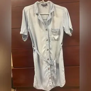 Chic light blue dress. Button-up front. Short sleeves. Waist tie detail.