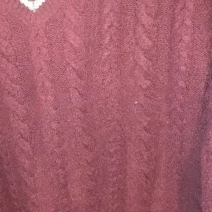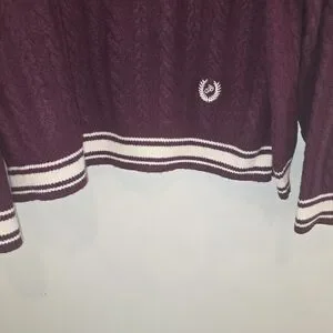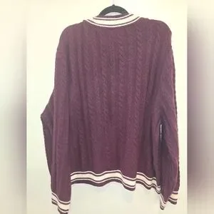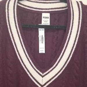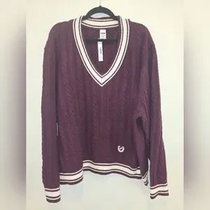 This is a women's long-sleeved V-neck sweater from PINK by Victoria's Secret. It features a rich burgundy or deep plum cable knit pattern throughout the body and sleeves, with distinctive double cream-colored stripes on the V-neckline, hem, and cuffs, giving it a varsity or cricket style. A small, embroidered P emblem is visible on the lower front left side. This is a size XXL and nwt.
