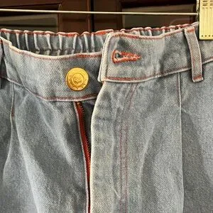 Light blue trousers with vibrant orange stitching. Elastic waistband for comfort. Made by Big Bud Press.
