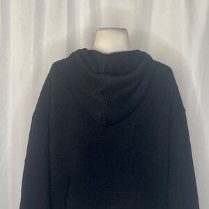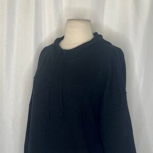 Attached hood at neckline … inset drawstring ties on the front of the neckline ~ Long sleeves with dropped shoulder seams ~ Straight hemline ~ Pullover styling … no closures ~ Soft unlined 100% cashmere knit fabric ~ Light ribbing at the sleeve cuffs and waistline ~ Solid black … so versatile!!