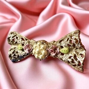 Elegant bow brooch with intricate gold detailing. Accented with pink and green floral designs. Perfect for adding a vintage touch. It is in good condition for its age. It measures approximately 1.75” wide x 0.75” tall.