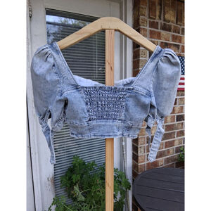 Women's Adika Blue Denim Puff Sleeve Ruched Crop Top XS