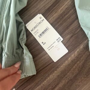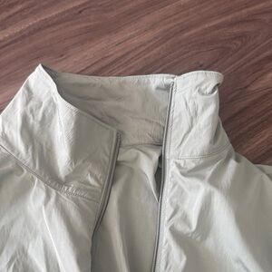 Stylish windbreaker bomber jacket in light green. Features a sleek design with elastic cuffs and hem. Perfect for casual outings.