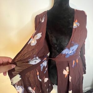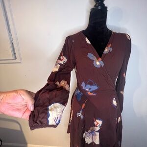 Chic wrap dress by Ecote. Burgundy base with white floral patterns. Long sleeves and flowy skirt. Perfect for casual outings.