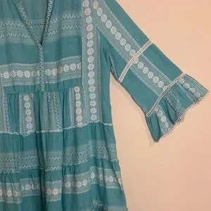 Stylish teal dress with white patterns. Features a tiered design and long sleeves. My weight loss is your gain:) Never worn.