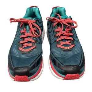 The Hoka One One Clifton 4 Running Shoe in women's size 8.5 offers a stylish and functional option for those engaging in various athletic activities. With a cushioned, lightweight design featuring a breathable synthetic upper and foam insole, this sneaker provides comfort and support for activities such as gym training, cross-training, crossfit, yoga, and running. The rubber outsole and lace-up closure ensure durability and stability during intense workouts. Available in a vibrant blue and pink color scheme, this shoe is perfect for both casual wear and active occasions, making it a versatile addition to any wardrobe.