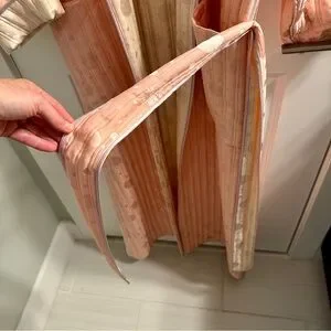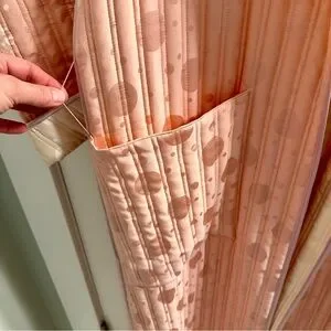 Elegant quilted silk robe with a soft pink exterior. Cream interior lining. Features two front pockets, waist tie, and a cozy collar. In very good used condition. No stains.