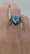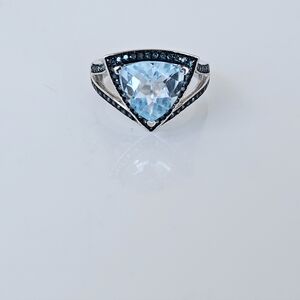 Genuine Colleen Lopez Trillant blue topaz 3.3 carats with .32 carats of genuine blue diamonds accenting the border of the ring. It has a split shank and a finished under gallery. It's a gorgeous ring crafted of sterling silver with rhodium overlay. Stamped by designer hallmark and 925. Size 6