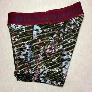 Lululemon stretch active shorts in black/raspberry with blue and white detail. Elasticized waistband with inner drawstring. Approx 4” inseam. Fitted look. Tight fit. Sweat wicking. Naturally breathable. Polyester/spandex. Size 4. Gently worn, great condition.