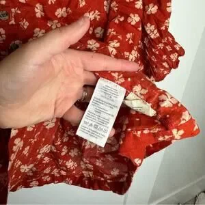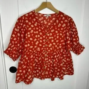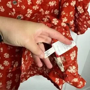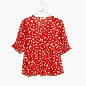 Vibrant red blouse with floral pattern. Features a V-neck and gathered sleeves. Perfect for casual wear.