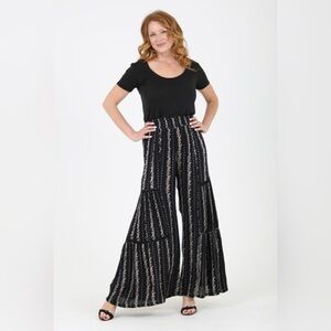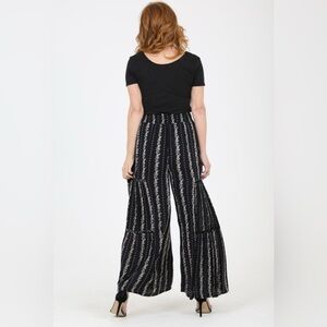 Stylish wide leg jumpsuit. Black and white striped pattern. Comfortable and chic design.