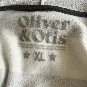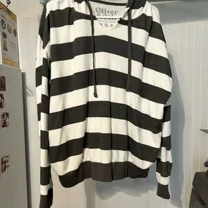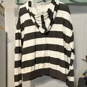 Soft V-neck hoodie with bold charcoal gray and white stripes. Comfortable and stylish with fleece lining. Never worn. Measurements in photos.