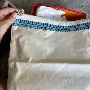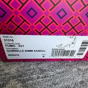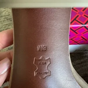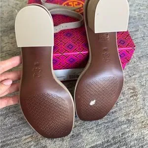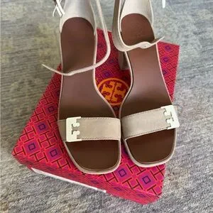 Chic Tory Burch heels with beige straps. Features white accents. Ideal for stylish outings.