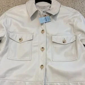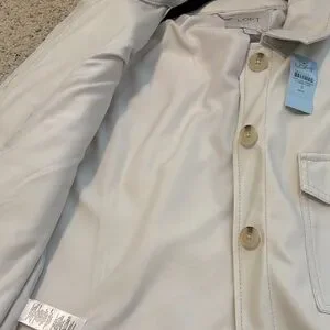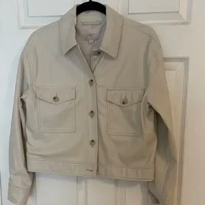 Stylish bone colored pleather jacket by LOFT. Features button closure and front pockets imitation leather new with tags