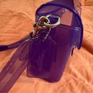 Authentic Coach Jelly Tabby in bright grape (purple) and silver hardware. Barely used. Comes with Coach hang tag, cross body strap, wristlet strap, and dust bag. No damage, but I did notch a hole in the cross body strap to make it adjustable for shoulder (see photo). Note this handbag is somewhat see-through.