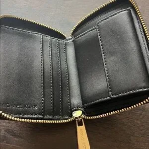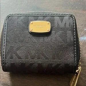 Elegant black wallet by Michael Kors. Features gold hardware and logo detail.