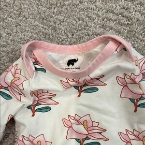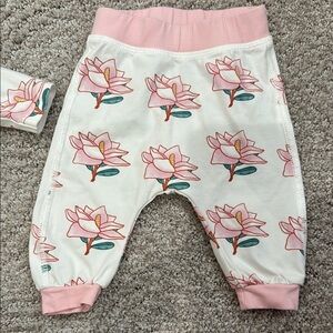 Adorable baby outfit with floral print. Includes matching hat. Perfect for any occasion.