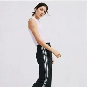 Black casual wide leg pants. Features white side stripes, pull on and small zipper pouch for storage on waist band. Ideal for workouts or casual wear. Size XS as shown.