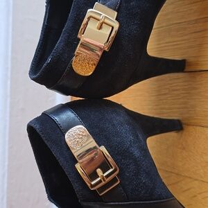 This Vince Camuto Velino is a black ankle boot featuring a high heel and gold-toned hardware. The shoes have a leather and suede upper and lining with an inside zipper closure. The Velino ankle boots are a great choice for dressing up any outfit for a night out or a professional look.