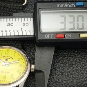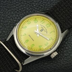 This watch has a stainless steel case in great condition with almost no flaws. The face features Green accents on a Yellow Face giving an awesome vintage look overall.