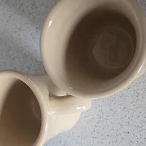 Enjoy your favorite beverages with this elegant set of cream ceramic coffee mugs. Perfect for any home dining setting. vintage so some wear on bottom, heavy mugs.