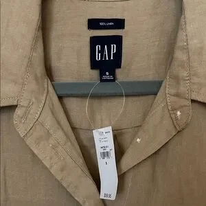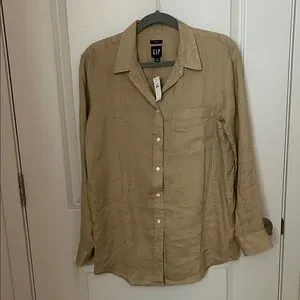 Classic 100% linen light brown shirt by GAP. Features a button-up front and chest pocket.