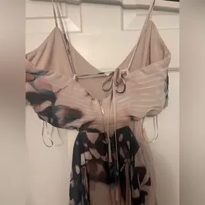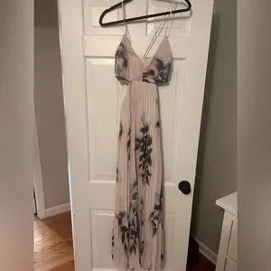Chic light pink maxi dress with elegant floral design. Features a flattering babydoll cut and delicate straps. Flattering for all bodies. Beautiful print. SIZE MEDIUM TALL.