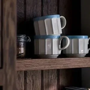 Elegant stoneware mug with a blue rim. Perfect for any beverage.