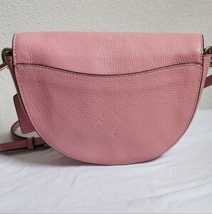 Chic Coach crossbody in bubble gum pink leather. Features gold-tone accents and adjustable strap. Perfect for everyday style.