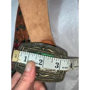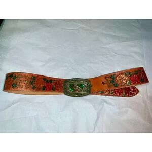 BEAUTIFULLY MADE TOOLED LEATHER BELT WITH HORSE BUCKLE (BRASS AND GREEN ENAMEL). MEASUREMENTS IN PHOTOS. UNISEX SIZE. BUCKLE IS DETACHABLE WITH SNAPS.