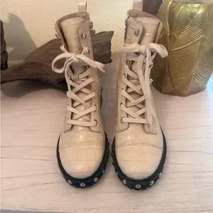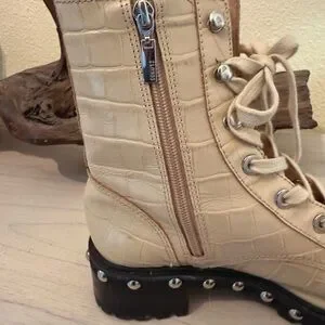 Step up your look with these cream croc-embossed combat boots. Stylish and versatile for any wardrobe.