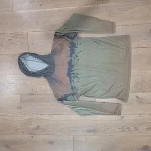 Orvis hoodie with a blend of green and orange. Unique design with a comfortable fit.
