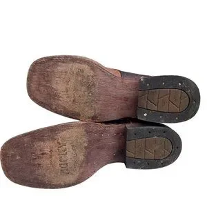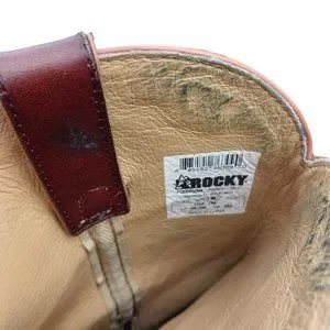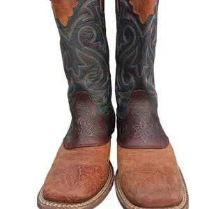 Stylish Rocky heeled boots. Brown leather with intricate blue patterns. Perfect for any occasion.