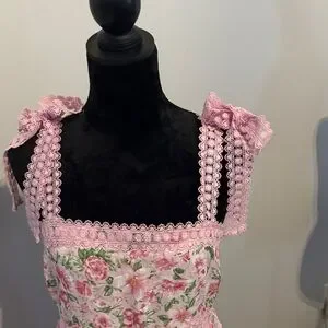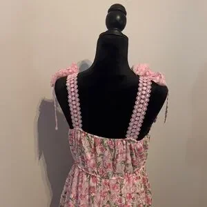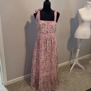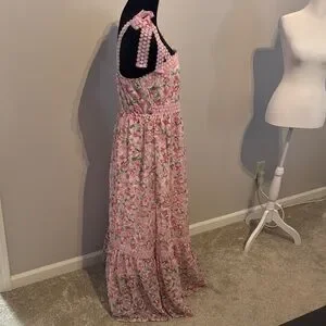 Charming pink maxi dress with floral pattern. Features pom-pom details and tie straps. Perfect for a casual day out.