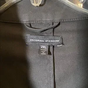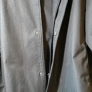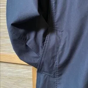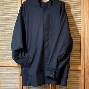 Lightweight black rain jacket, zip and snaps in the front, snaps on cuffs. Mid-thigh length on 5’8”. Roomy enough to layer a sweater underneath when the. Two large pockets. Worn a few times. Excellent condition. Size 2XL would be equivalent to a 28-30 woman’s size.