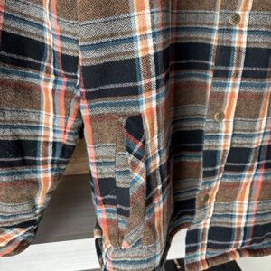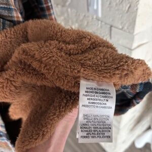 100% cotton plaid handsome jacket with oatmeal colored hoodie w/drawstrings. Soft and warm sherpa lining, side pockets & front pockets. Warm, comfortable and great looking!