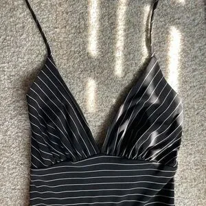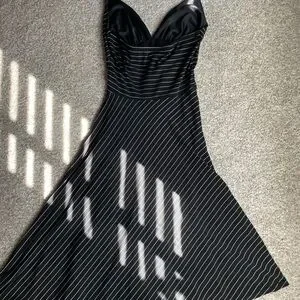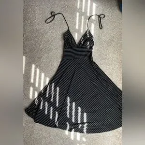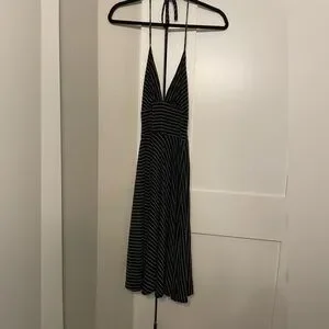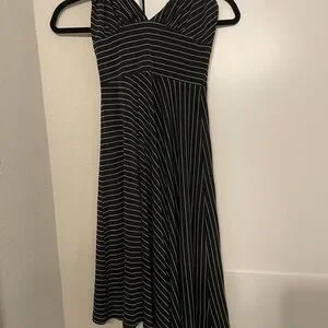 Chic asymmetrical halter dress with tie neck, and black and white stripes. Features a flattering fit and stylish design. Note - not lined and does not have any zippers or clasps - it’s a “step-in” dress or “over the head.” Very flattering and looks gorgeous on.