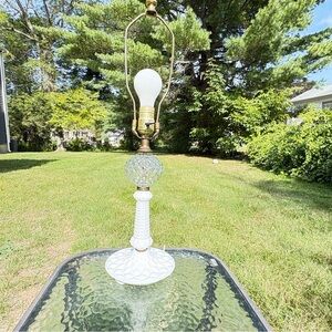 beautiful mid-century milk glass table lamp. Standing 23” tall, this lamp features a hobnail milk glass base with raised beading, a quilted pressed glass globe center, and brass hardware. In very good vintage condition and fully functional, this lamp is perfect for farmhouse décor, shabby chic styling, or a retro bedroom or living room accent. No shade included.
