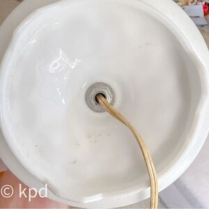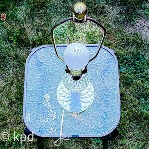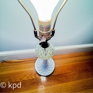 • Condition: Working; harp included, shade not included. Patina consistent with age: Lamp works; the wiring may not be original (the flat 2-prong plug looks mid-20th century but replacement cords were common). Parts feel like they can rotate, which suggests sectional assembly (typical of lamps made from pressed glass and milk glass parts in the 1940s–1960s).