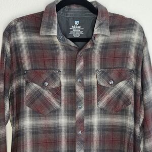 Kuhl plaid button-up shirt in red and gray. Features long sleeves and chest pockets.