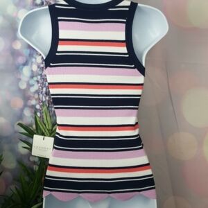 A striped rinbed tank. Scalped hem sleeveless striped tank. Stretchy material colors are purple navy blue coral and white.