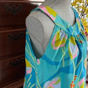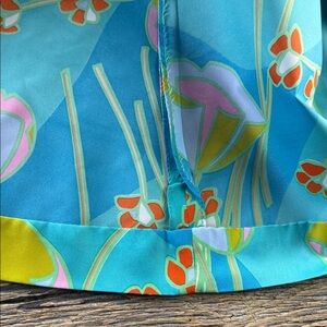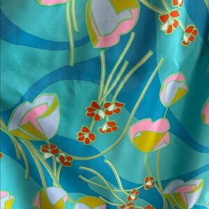 Lightweight, hand washable, silky fabric in a vibrant mix of turquoise, pink, lime, and orange with abstract floral and water lily motifs