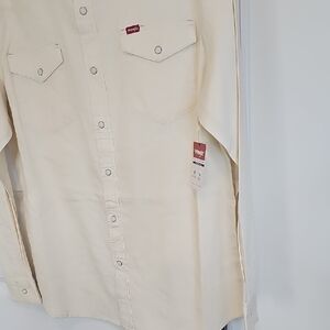 Classic cream button-down by Wrangler. Ideal for casual outings. Features dual chest pockets.